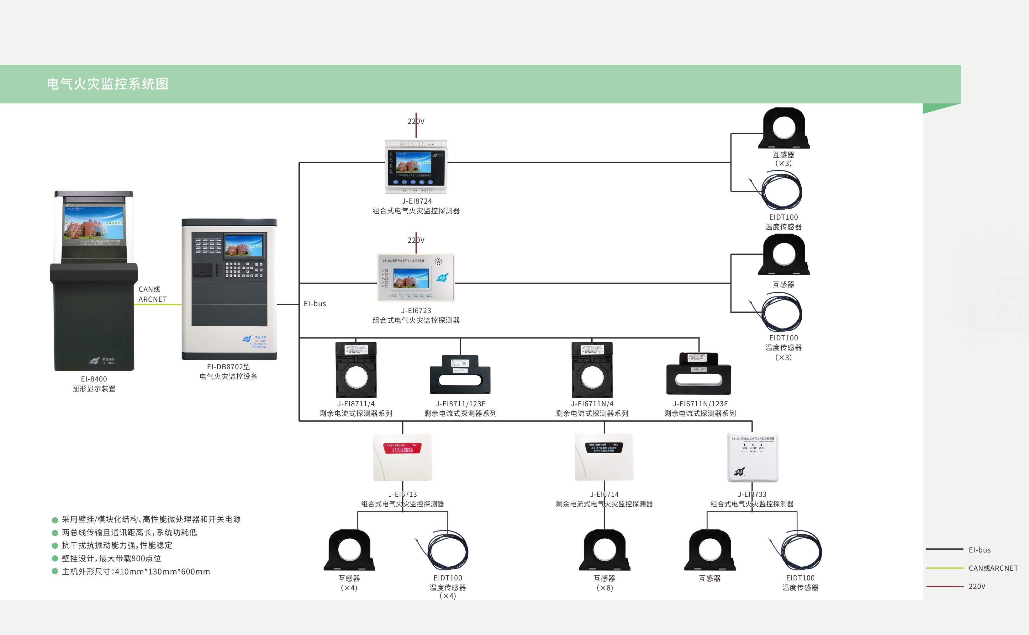 可通過(guò)探測電氣線(xiàn)路剩余電流和溫度等參數進(jìn)行火警判斷,具有預警、報警等多重保護和配置、編程、聯(lián)動(dòng)、屏蔽、查詢(xún)、聯(lián)網(wǎng)、測試、打印、故障檢測、歷史記錄等功能,可顯示各探測器當前檢測值以及在消防控制室圖形顯示裝置上顯示系統圖、平面圖、疏散路線(xiàn)等,顯示直觀(guān),方便使用。
